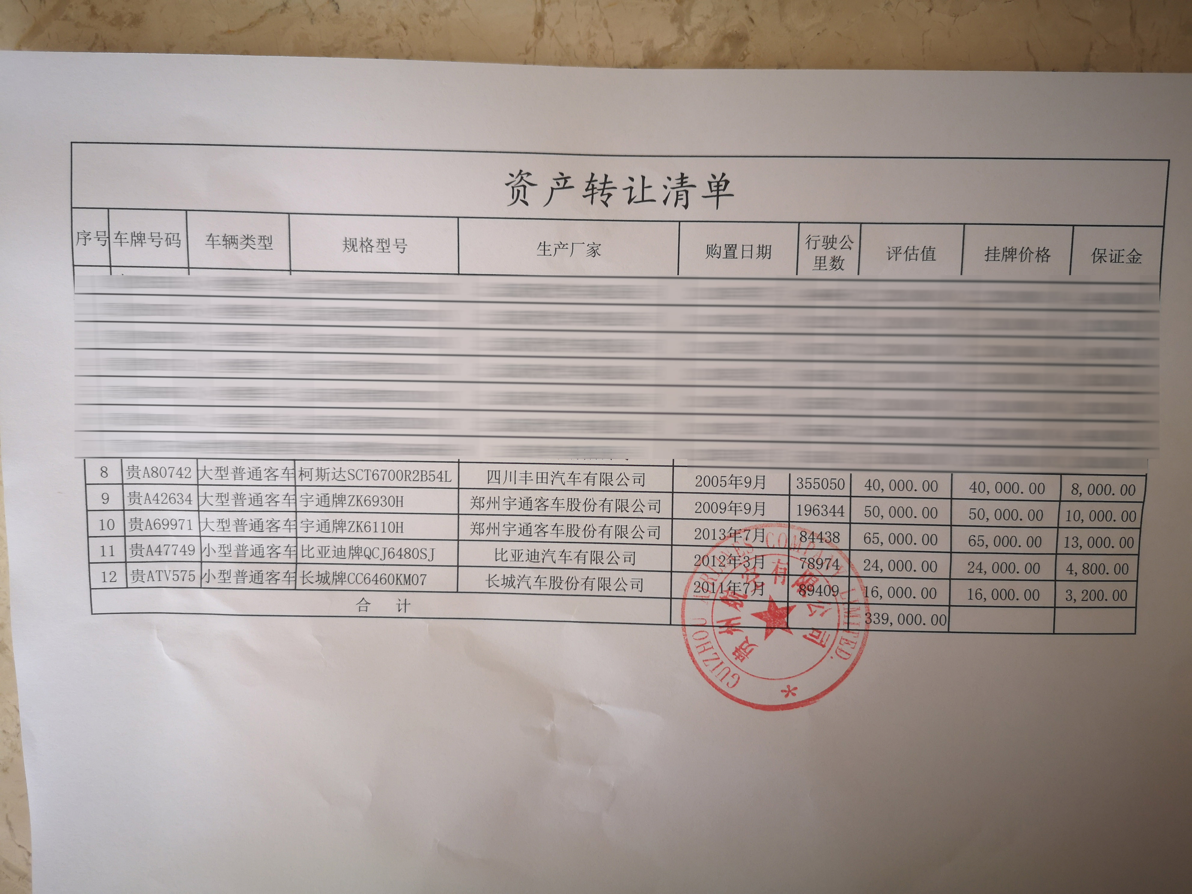 | 重要信息披露 | 1、意向受讓方須自行了解本次轉(zhuǎn)讓標(biāo)的的全部現(xiàn)狀及瑕疵,本次轉(zhuǎn)讓標(biāo)的以現(xiàn)狀轉(zhuǎn)讓; 2、本次轉(zhuǎn)讓車輛共5臺(tái),可單輛受讓,也可多輛受讓; 3、本次轉(zhuǎn)讓的所有車輛由轉(zhuǎn)讓方協(xié)助受讓方辦理過戶手續(xù),過戶產(chǎn)生的所有費(fèi)用由受讓方承擔(dān); 4、本次轉(zhuǎn)讓的5臺(tái)車輛均無違章情況并已全部年審; 5、本次車輛有關(guān)信息詳見《資產(chǎn)評(píng)估清單》。 | |||||||
