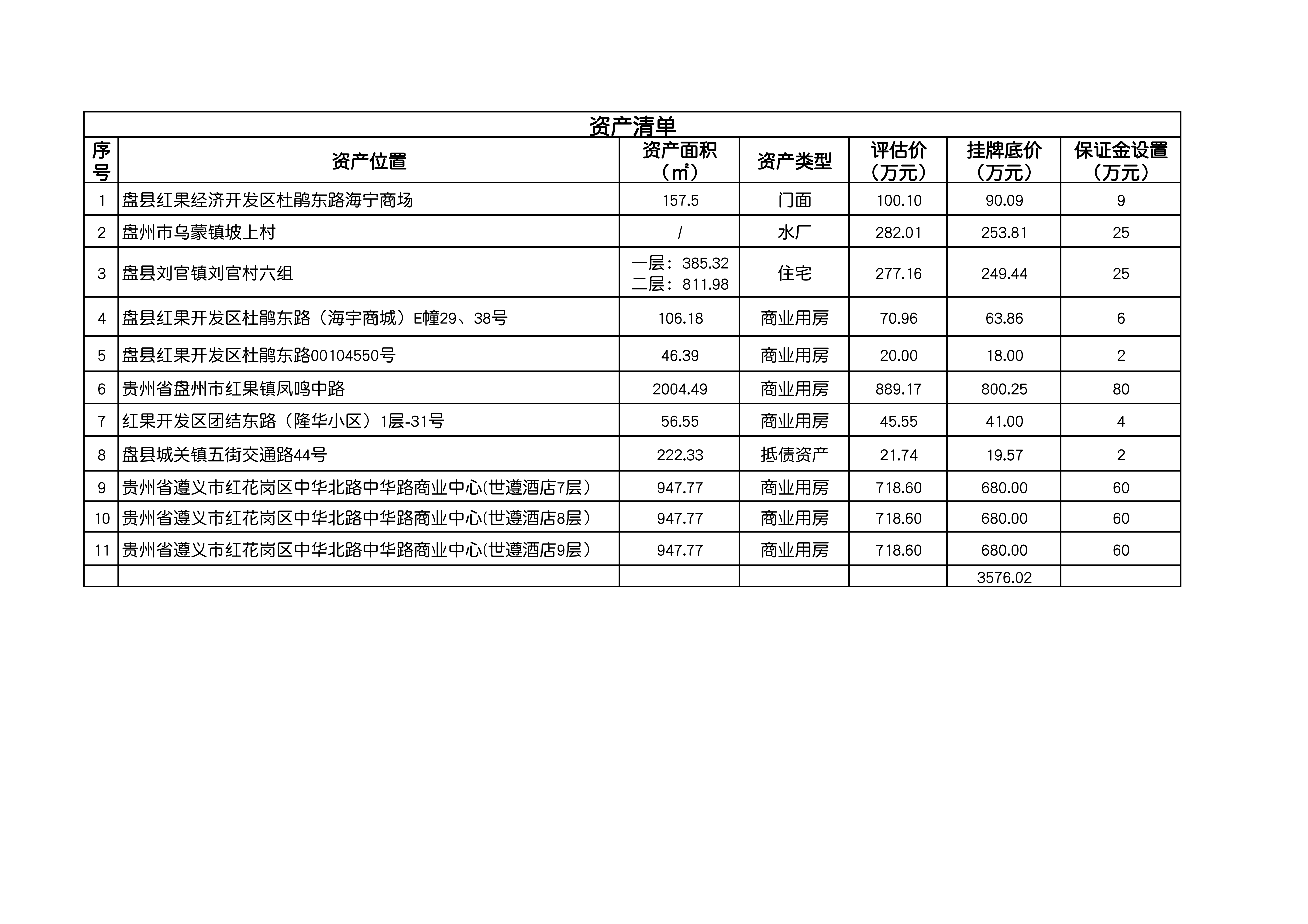 | 資產(chǎn)公告信息 | 資產(chǎn)描述 | 本次擬轉讓的資產(chǎn)共計11處,8宗資產(chǎn)位于貴州省盤州市、3宗資產(chǎn)位于貴州省遵義市紅花崗區(qū)中華北路中華路商業(yè)中心(各標的情況詳見附件清單) | ||||||